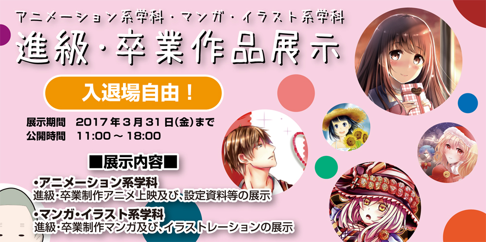 今春卒業した学生達の『卒業制作』をはじめ、在校中の課題作品展示、上映を本校校舎内にて開催いたします。 ■展示期間■ 2017年3月6日(月)~3月31日(火...