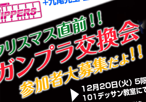12月20日(火)の放課後、クリスマスプレゼント交換企画として「ガンプラ交換会」をやります!!!先日の学園祭でもガンプラを作っている学生が案外たくさんいてびっく...