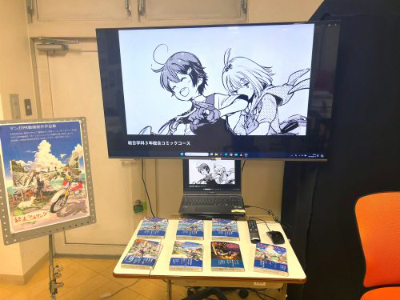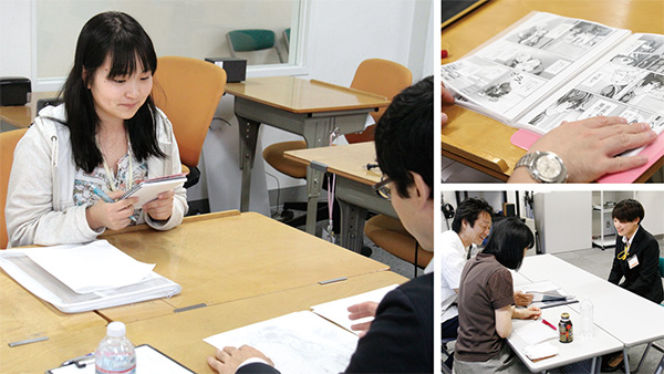 漫画編集部やイラスト・ゲーム制作会社の担当者が多数来校し、学生の作品をチェックする「持込み」を学内で再現します。一日に何社もの担当に ていただくことが可能となり、学生たちのデビューや就職への機会を広げています。